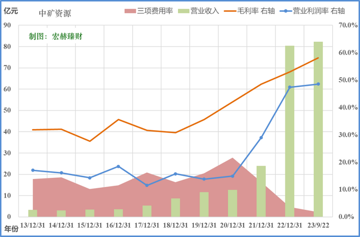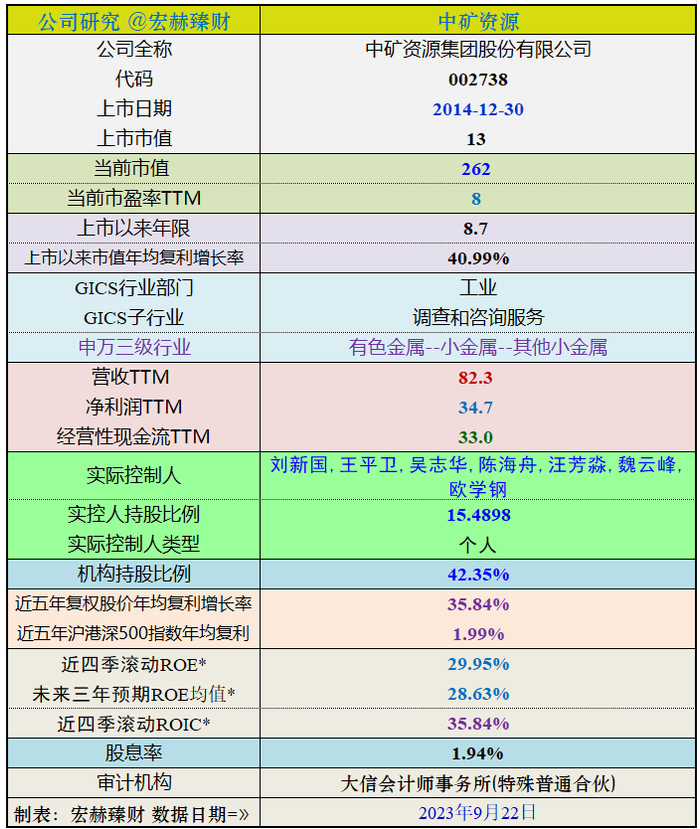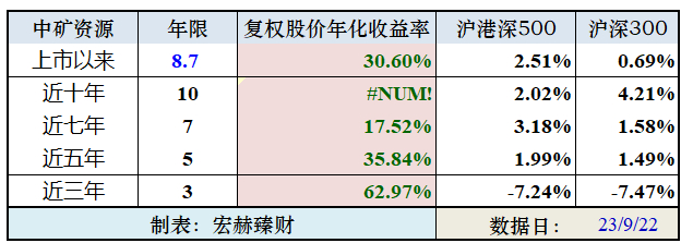 中矿资源 上市以来8.7年的光阴里,市值由13亿走至当前的262亿。市值年均复利增长率约为40.99%,复权股价年化回报率约为30.60%,同期沪港深500指数年化回报率为 2.51%。