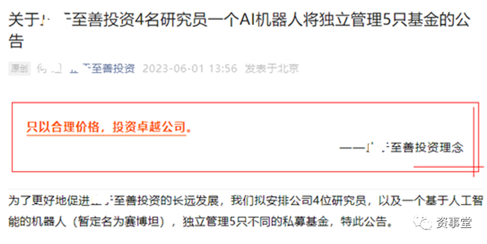 今年6月初,XX至善对外宣布拟安排公司4位研究员,以及一个基于人工智能的机器人,独立管理5只不同的私募基金。