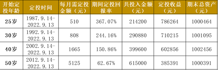 基金定投本身就是以时间换空间的投资方式。假设我们60岁退休时(2022年9月13日)需要储备100万元的养老金,那么以1987年9月14日起定投美国标普500指数倒推测算实际收益率(期间经历过多轮牛熊市)为例: