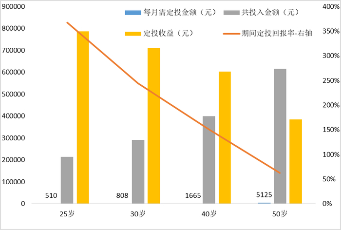 在25岁就开始定投,每月只需投入510元,累计本金21.42万元,收益率达到367.07%;
