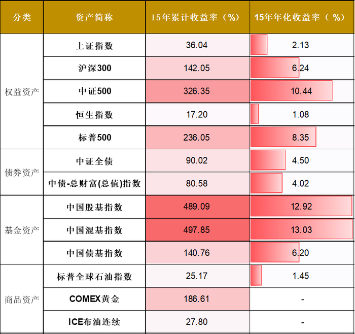 统计2007年以来十五年间居民可投资产表现情况可以看出,基金资产在长期收益上显著优于相应权益、债券及商品资产,公募基金主动管理能力凸显。