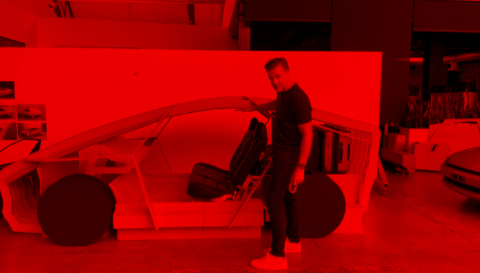 设计师弗朗茨·冯·霍兹豪森和特斯拉早期的自动驾驶出租车(图片来自《埃隆·马斯克传》)