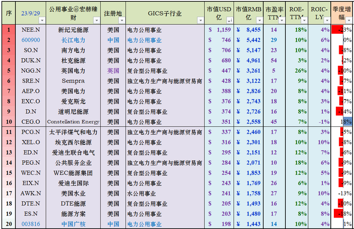 公用事业行业榜本季度中国公司只有2家,长江电力以746亿美元升至第2位;公用事业行业投入资本回报率ROIC很低,前20均值只有4%;ROE前20均值只有10%,长期资本基本不Care。