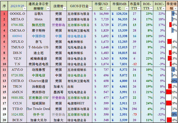 通讯业务业部门三强:谷歌、Meta、腾讯。中国公司有5家上榜。