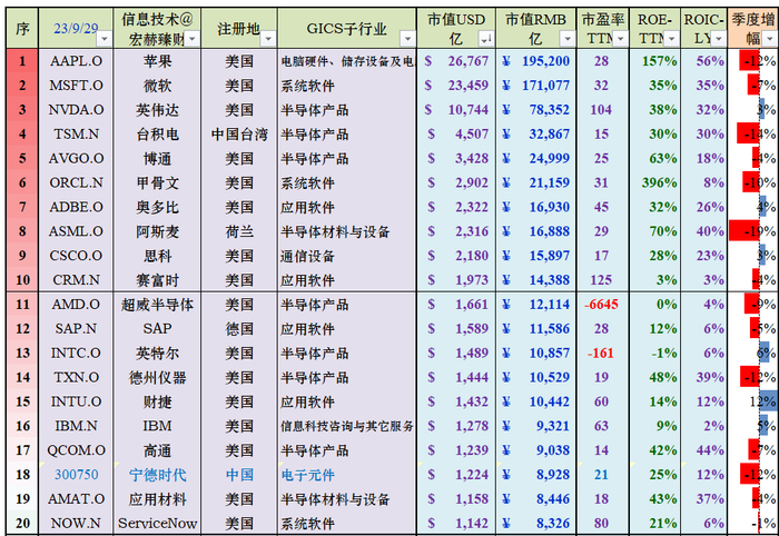 信息技术行业部门中国公司仅有宁德时代一家入围,本季度第18位(上季度第15),该行业榜首苹果公司2.68万亿美元市值比上季度有所回落,台湾的台积电本季度保持第4位。
