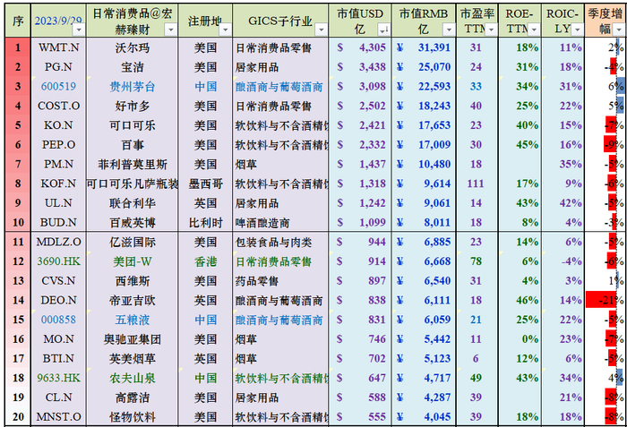 3、中美“日常消费品”行业部门市值Top20★