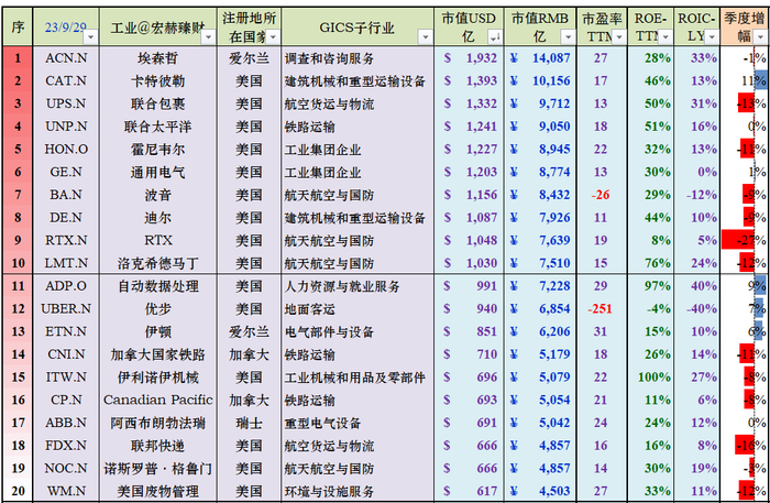 本期工业三强:埃森哲(爱尔兰)、卡特彼勒(美国)、联合包裹(美国)