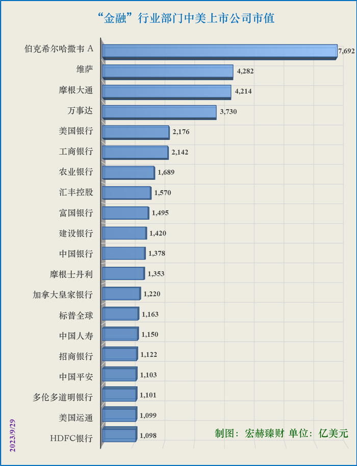 巴菲特掌舵的伯郡本季度市值升至7692亿美元,继续稳居金融行业榜首。