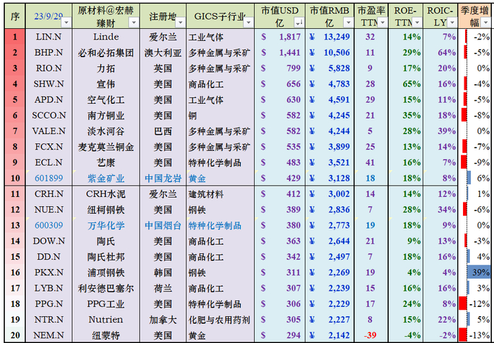 本期原材料三强:Linde、必和必拓集团、力拓