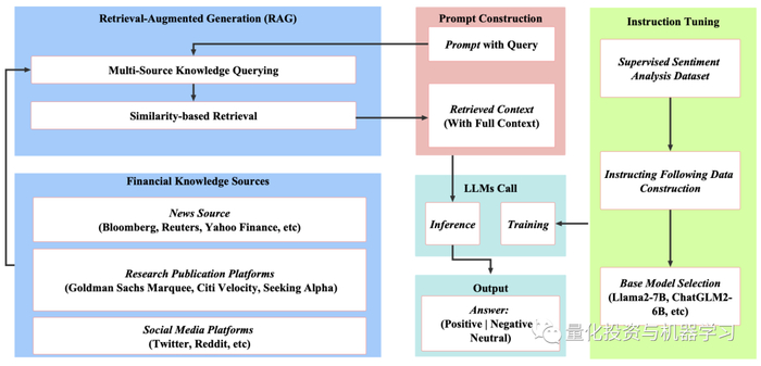 为了应对上述挑战,在我们的研究中,我们提出了一个检索增强的大型语言模型金融情绪分析框架。该框架由两个关键组件组成: