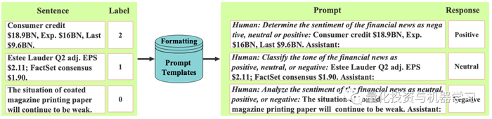 1、首先,我们构建了一个指令跟随数据集,由成对的指令和它们相应的情绪标签组成。该数据集是指导LLM有效理解用户指令的基础。格式化金融情绪指令跟踪数据集:通过手动标记创建金融情绪指令跟踪数据集需要专业金融专业人员的专业知识,这可能是昂贵的。另一种方法是以较低的成本将现有的有监督的金融情绪分析数据集转换为指令遵循数据集。这些数据集通常被格式化为文本分类任务,其中输入是金融新闻或标题,输出是表示积极、消极和中性情绪的整型标签。接下来,我们创建了10条描述金融情绪分析任务的人工编写指令,并将随机选择的一条指令与输入和输出结合起来,以“人类:[指令]+[输入],助手:[输出]”的格式,从原始数据集中制定每个样本。该过程如下图所示。