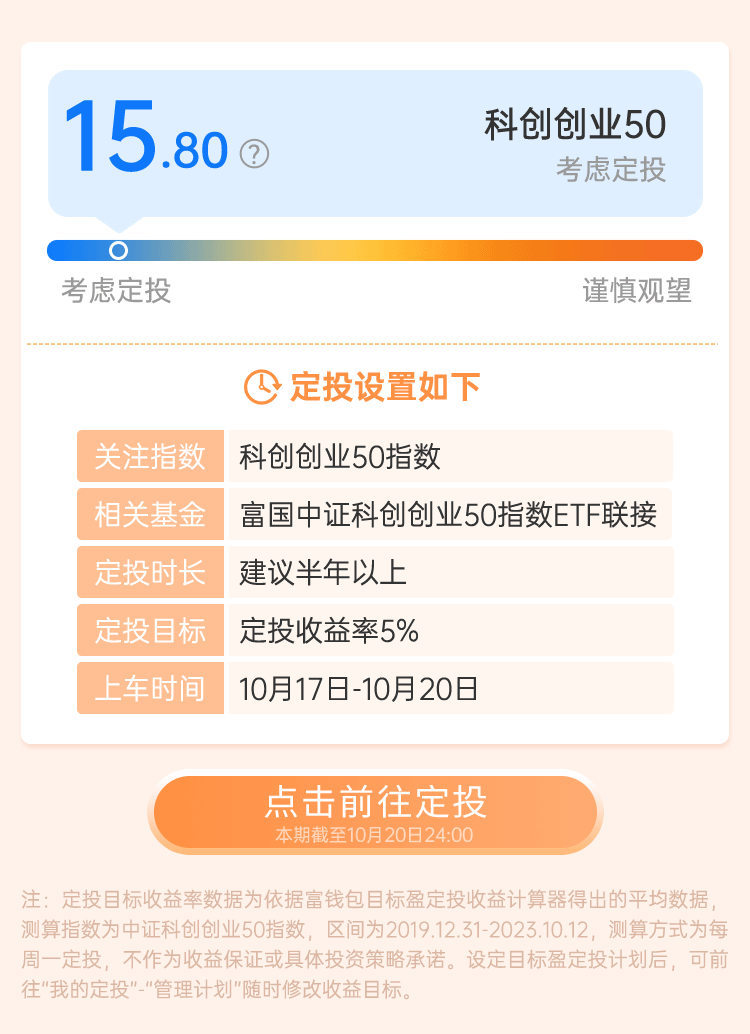 1.富国指数宝打分根据市场历史数据结合模型测算而来,数据来源wind,仅供参考,以上内容不代表对市场和行业走势的预判,也不构成投资动作和投资建议,且可能根据市场情况变化而调整。基金所跟踪标的指数的历史表现不预示其未来表现,不构成对基金业绩表现的保证。请投资者关注指数基金投资风险,包括但不限于标的指数回报与股票市场平均回报偏离、标的指数波动、基金投资组合回报与标的指数回报偏离等特有风险。本基金是目标ETF联接基金,将面临例如目标ETF的管理风险与操作风险、目标ETF特有风险、目标ETF的技术风险等风险。本基金可投资科创板股票、股指期货、股票期权、资产支持证券、存托凭证、参与融资与转融通证券出借业务,将面临特殊投资标的所对应的特有风险。基金有风险,投资需谨慎。