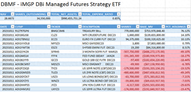 根据其最新的持仓,DBMF继续做空美国国债期货,做多原油,同时做多欧元,做空日元(背后主要是押注欧洲需要继续加息,而日本不需要),另外,DBMF还在做空黄金。