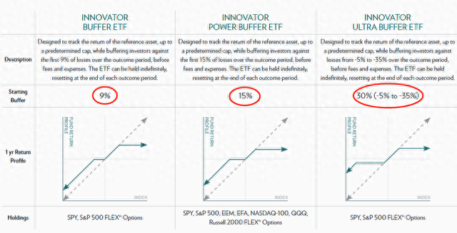 针对标普500,Innovator还贴心的设置了三种不同程度的缓冲带: