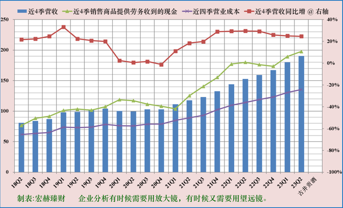 绿色折线接近或高于蓝色柱图上边,显示营业收入含金量高。