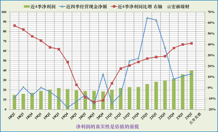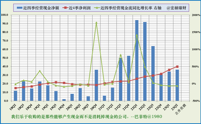 蓝色折线持续在绿色柱图上边及以上,显示净利润含金量高。