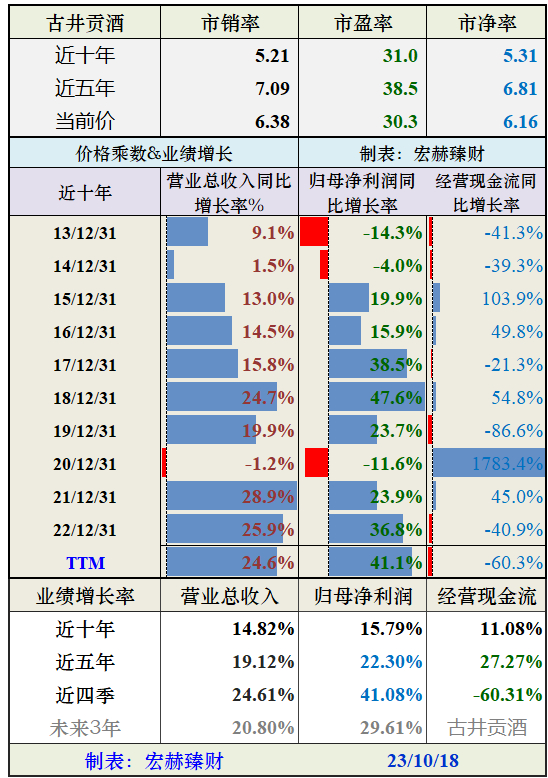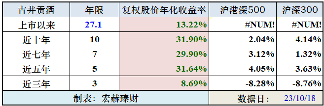 古井贡酒 上市以来27.1年的光阴里,市值由44亿走至当前的1214亿。市值年均复利增长率为13.06%,复权股价年化回报率为23.22%,同期上证指数年化回报率为 4.60%。