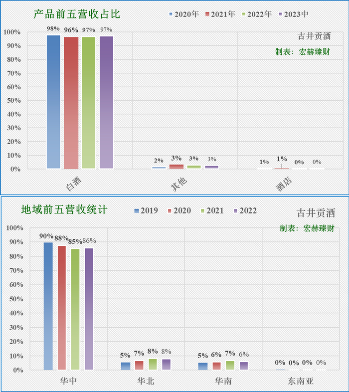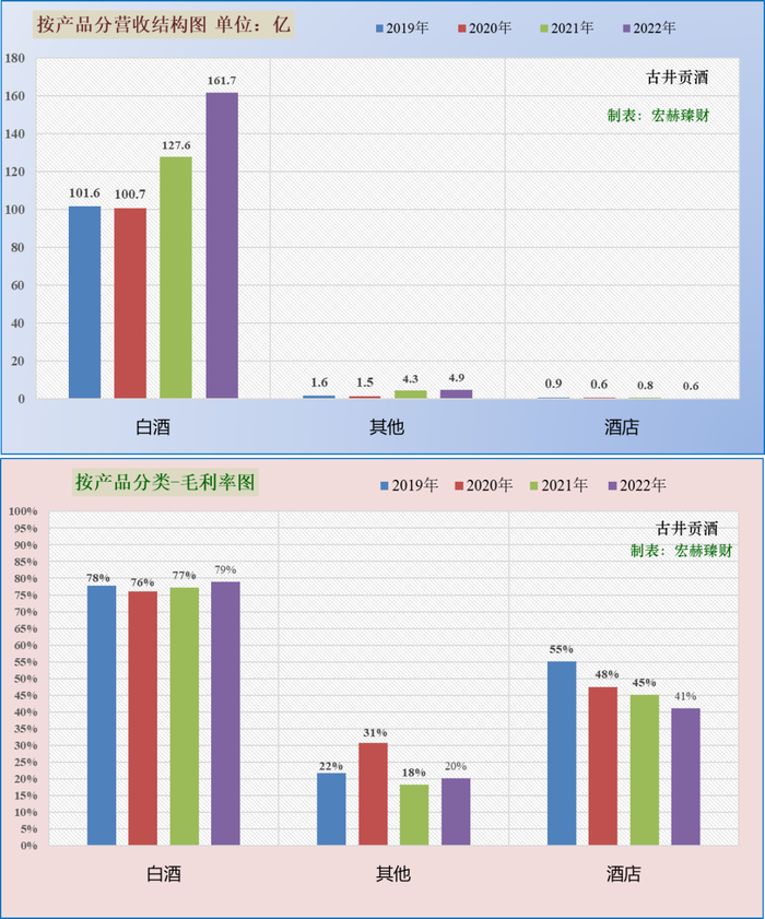 第一主营业务白酒占营收比权重为97%,近三年同比增幅分别为:-1%、27%、27%;当前毛利率79%。