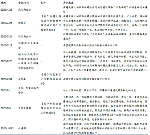 从政策表述上看,城中村改造先后在政治局会议,国常会,等高级别会议上提出,同时由多部委统筹,下发到各个地方进行自行组织推进,并将改造情况统一到住建部备案。可见中央对其重视程度:起调较高,有具体措施,并且监督地方执行,如果后续取得积极成效,后续相关政策出台和地方推进速度有望加快。