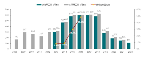 2017年棚改货币化比率在60%以上。棚改货币化有效的解决了2014年房地产市场出现了库存高位但是销售低迷的情况,通过 PSL 的调节,棚改货币化安置的推进成功刺激了购房需求,房产库存快速去化。棚改货币化之余房地产去库存包含两层含义,一个是棚改群体手持赔偿金需要安置购置新房,领一个更重要的是新增发货币大量用于地产市场带来房价上涨,更多刺激居民的投资型购房需求。