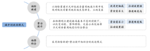 历史上的城市更新,除老旧小区改造之外,通常以拆除新建为主。但本轮城中村改造并不局限于拆除新建,也可以采用整治提升和拆整结合的改造模式。后者整治提升模式的拉动效果可能不及拆除新建,但资金投入和推进阻力相对较小。