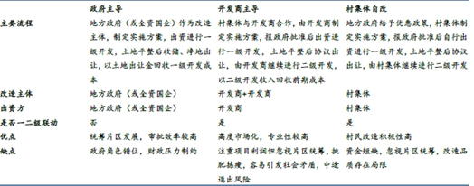 同时坚决落实因城施策,各地根据自身财政资金状况,当地城中村复杂情况进行因城施策。根据改造主体划分为政府主导、开发商主导、村集体自改三种操作模式。其中,政府主导模式将一二级开发切分开,一级开发和二级开发由不同的主体实施;开发商主导和村集体自改则可以一二级联动,即开发商/村集体完成一级开发后,能够低于市场价锁定项目的二级开发权。过去,开发商或村集体主导占据旧改的绝对优势,未来,这块业务讲更多归为国企所有。
