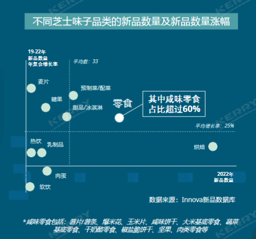 芝士零食也是近些年才兴起的新品类。凯爱瑞发布的《2023年芝士味咸味零食洞察报告》显示,芝士零食是新品总数最大、新品数量增长速度最快品类,而芝士味咸味零食新品占比超过零食新品的六成。