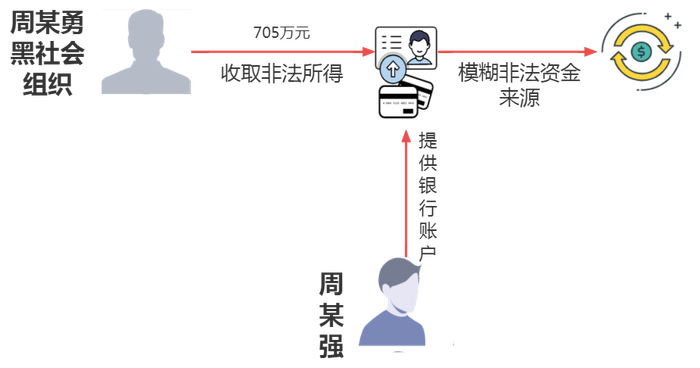 清远周某强洗钱案中,周某强在明知周某勇组织、领导黑社会性质组织的情况下,仍将本人银行账户用于收取非法所得,先后收取该组织诈骗所得款项705万元,协助模糊非法资金来源。