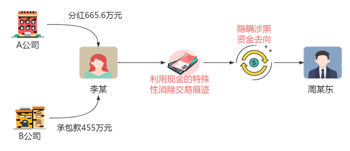 清远李某洗钱案中,李某作为公司财务人员,在明知A公司的股份与周某德参与的黑社会性质组织犯罪有关并且已经被冻结的情况下,仍协助周某东通过现金方式分配A公司股权分红665.6万元及B公司给予的承包款455万元,企图利用现金的特殊性消除交易痕迹,隐瞒涉黑资金去向。