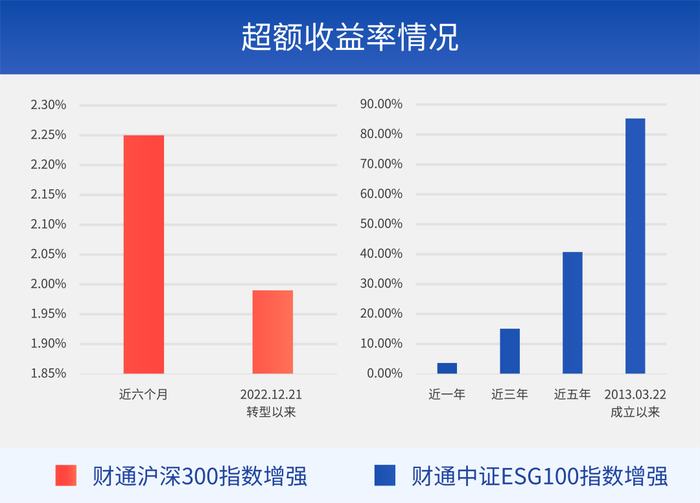 数据来源:净值增长率来自财通基金产品定期报告,财通沪深300指数增强成立于2019年1月30日,自2022年12月21日起转型为财通沪深300指数增强型证券投资基金;朱海东自2019年7月16日开始任职基金经理;截至2023.09.30,基金净值增长率(同期业绩比较基准)转型以来-1.43%(-3.42%),近六月-6.22%(-8.47%);财通中证ESG100指数增强成立于2013年3月22日,顾弘原自2023年1月16日开始任职基金经理;A类从2013.3.22至2022.12.31期间,完整会计年度收益率(同期业绩比较基准)分别为48.99%(53.00%)、11.72%(9.19%)、-8.52%(-7.87%)、20.77%(24.14%)、-16.95%(-23.10%)、30.93%(25.10%)、36.01%(18.35%)、13.23%(5.96%)、-17.47%(-19.63%);截至2023.09.30,A类基金净值增长率(同期业绩比较基准)成立以来143.80%(58.43%),近五年51.95%(11.22%),近三年8.64%( -6.43%),近一年4.74%( 1.09%);C类无净值增长率。历史数据仅供参考,我国基金运作时间较短,基金的过往业绩并不预示其未来表现,基金管理人管理的其他基金业绩不构成基金业绩表现的保证。