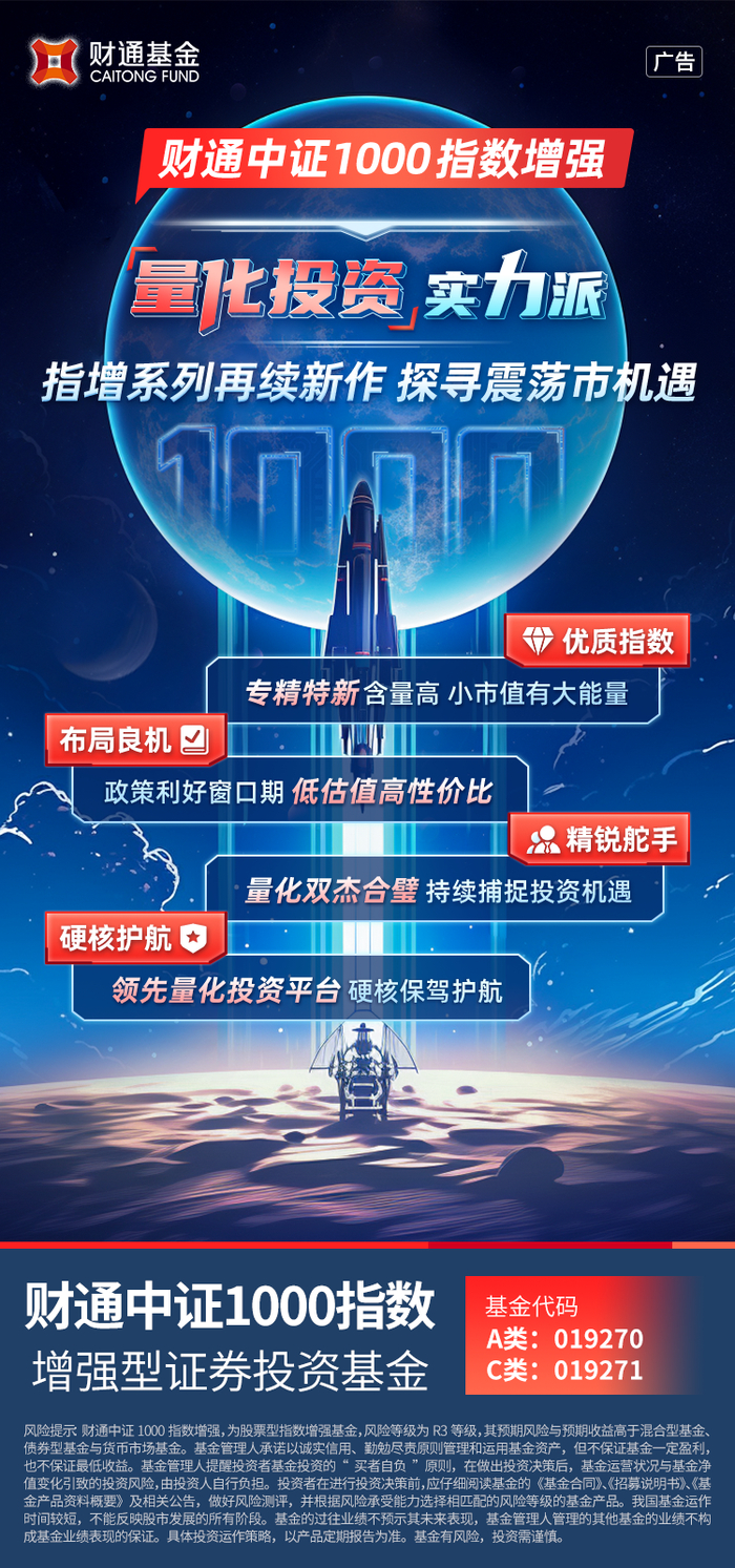 风险提示:财通中证1000指数增强、财通沪深300指数增强、财通中证ESG100指数增强为股票指数增强型基金,风险等级为R3等级,其预期风险与预期收益高于混合型基金、债券型基金与货币市场基金。本基金管理人承诺以诚实信用、勤勉尽责原则管理和运用基金资产,但不保证本基金一定盈利,也不保证最低收益。基金管理人提醒投资者基金投资的“买者自负”原则,在做出投资决策后,基金运营状况与基金净值变化引致的投资风险,由投资人自行负担。投资者在进行投资决策前,应仔细阅读本基金的《基金合同》、《招募说明书》、《基金产品资料概要》及相关公告,做好风险测评,并根据风险承受能力选择相匹配的风险等级的基金产品。基金有风险,投资需谨慎。文中市场判断不对未来市场表现构成任何保证,历史情况仅供参考;文中基础信息均来源于公开可获得的资料,基金管理人力求可靠,但对这些信息的准确性及完整性不做任何保证,获得报告的人士据此做出投资决策,应自行承担投资风险。