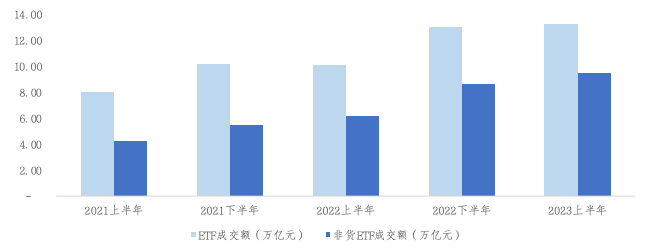 随着国内ETF产品不断扩容,投资者对ETF投资的认可度不断增加,ETF交投活跃度持续提升。2023年上半年,国内ETF总成交额合计13.14万亿元,非货币ETF总成交额达9.47万亿元,ETF半年度成交总金额创历史新高。