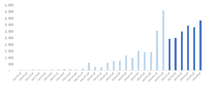 目前债券ETF整体数量较小,2022年底新发多只政金债ETF导致债券ETF成交额高企。2023年上半年,债券ETF成交额在1月份大幅回落之后趋于稳健增长,整体上已超过跨境ETF,总成交额为1.83万亿元,占比从2022年下半年的10%提升至14%。随着债券ETF产品数量增加、产品类型丰富、产品规模增长,预计未来债券ETF交投活跃度将进一步提升。