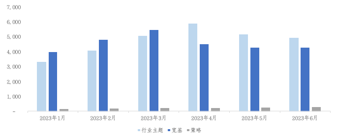 股票ETF整体来看交投波动较大,于4月大幅上升后有所回落。2022年下半年以来,受市场行情影响,整体来看宽基ETF成交额超过行业主题ETF。2023年二季度开始,宽基ETF交投整体下降明显,行业主题ETF成交额反超宽基ETF。