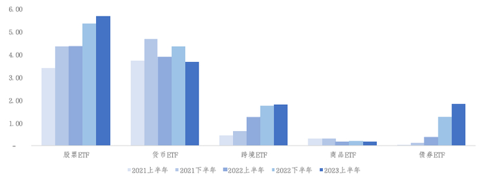 2023年上半年,各类型ETF交投活跃度继续分化。相比2022年下半年,股票ETF、债券ETF、跨境ETF上半年总成交额均有不同程度的上涨,货币ETF和商品ETF总成交额有所下降。