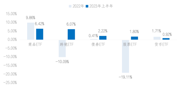2023年上半年,受市场行情分化影响,ETF业绩涨跌互现,ETF市场整体小幅收涨。截至2023年上半年,全市场ETF的平均价格涨跌幅为2.21%,平均净值涨跌幅为2.18%。分产品类别看,2023年上半年商品ETF净值涨幅居首位,增长6.42%,价格涨幅也居首,为6.45%,但增幅较2022年底收窄。跨境ETF、股票ETF止跌收涨,价格涨幅分别为5.91%、1.87%。债券ETF实现2.29%的价格涨幅,较2022年涨幅有所扩大。