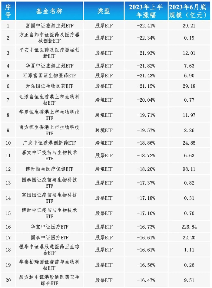 2023年上半年价格跌幅靠前的ETF皆为旅游类、医药类ETF。其中,2只旅游ETF跌幅超20%。受市场行情影响,医药相关ETF全面下跌。