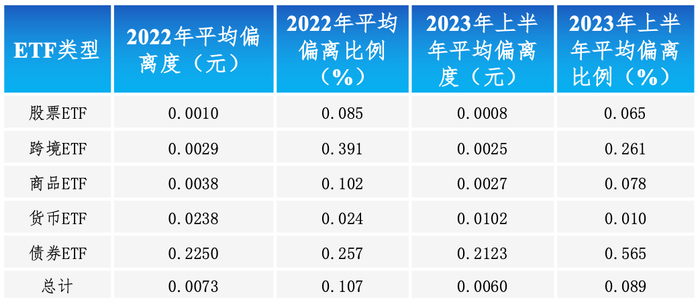 数据来源:wind,截至2023年6月30日;平均偏离度为所有ETF折溢价绝对值的平均值,平均偏离比例为所有ETF折溢价率绝对值的平均值。