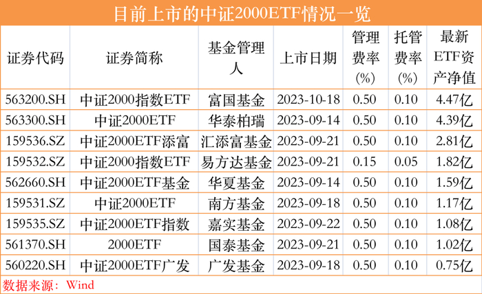 而在目前全市场9只中证2000ETF中,易方达是最先宣布降费的一方,目前易方达中证2000ETF的综合费率已经降至0.2%,其余8只中证2000ETF的综合费率为0.6%。“与中证1000ETF情况不同的是,目前首批中证2000ETF上市时间不长,规模差距并不大,规模最大的与规模最小的中证2000ETF之间差距不到4个亿,费率战或许能够再次扰动中证2000ETF的格局。”一位业内人士评价。