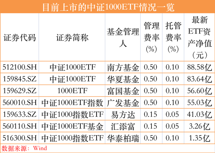 通过此次降费,易方达中证1000ETF的综合费率降至0.2%,与汇添富中证1000ETF同处最低水平。中证1000ETF联接基金的费率最低者也被易方达、汇添富包揽,两者的综合费率也同为0.2%。