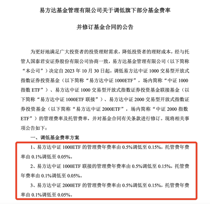 这个周末,管理规模达3万亿的基金“一哥”易方达基金再次宣布旗下部分ETF降费。10月28日,易方达基金公告,自10月30日起,调低旗下中证1000ETF、中证1000ETF联接基金、中证2000ETF的管理费率及托管费率。