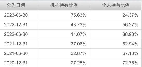 2022年12月末,机构持有该产品比例是43.73%,到了2023年6月末已经提升至75.63%,如下图: