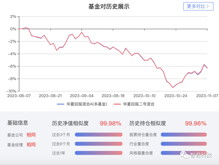 基金规模增大时,由于调仓成本等原因,管理难度会变高,原本表现优异的主动管理型基金的表现会趋于平庸。同样的,我们可以在智策的相似基金处搜索与其相似但规模较小的基金作为替代。以华夏回报混合A(002001)为例,该基金的规模为108.99亿。华夏回报二号混合(002021)与该基金的预测相似度为99.99,但规模不到50亿。两基金的选股、行业配置都非常相似,前十大重仓股有多个重合,资产配置也均为持有70%左右的股票仓位。