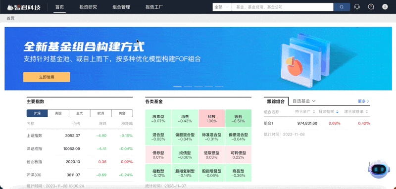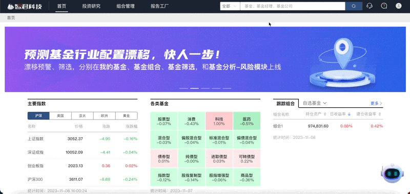 进入智君相似基金产品界面后,可以搜索需要查询的基金,将筛选出的基金进行组合分析,创建基金池,也可以通过产品概览、收益与风险、资产配置及收益归因多角度对比相似基金。