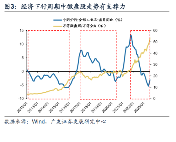 另一块,微盘股指数与经济相关性低,在过去10年宏观经济滑坡的年景里,万得微盘股相较于万得全A的比值一直稳中有升,并没有随经济基本面而起伏。