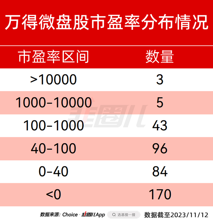 万得微盘股指数成分股最新的统计,有401只股票占比40%的公司是亏钱的,100倍、1000倍、10000倍PE以上的合计51只,也就是说不是太烂就是太贵,要么又贵又烂。