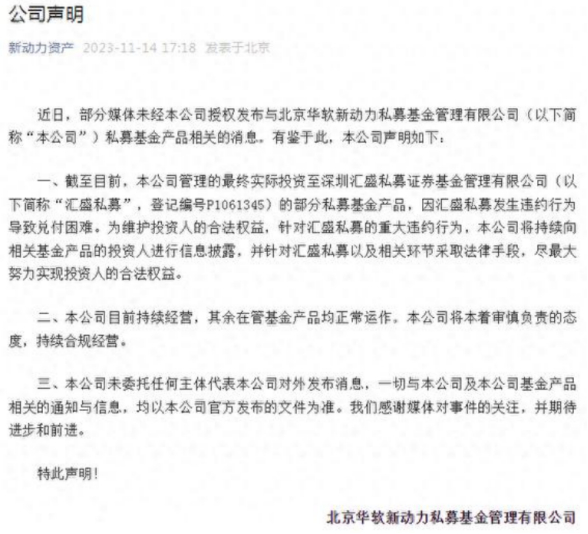 新动力资产表示,其产品实际投资至深圳汇盛私募证券基金管理有限公司(下称“汇盛投资”)部分私募基金,但最终因汇盛投资发生违约行为导致兑付困难,且对此已采取法律手段维权。