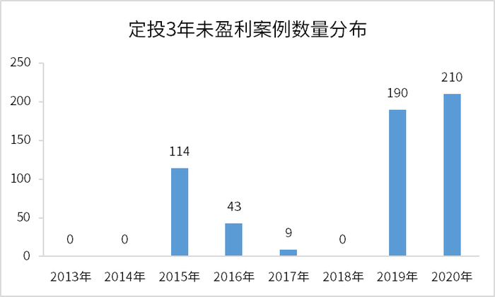 如上图所示,这些亏损案例出现的时间非常集中,分别是经历了“疯牛”后退潮的2015-2016年以及内外因素交织、“困住”了不少新基民的2019-2020年。