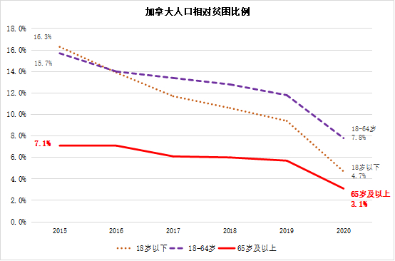 根据加拿大统计局的调查数据,2015年以来,各年龄段的人员相对贫困率都在降低,其中65岁及以上老年人的相对贫困率大幅度低于18岁以下和18~64岁人口,而且在2020年进一步降低到3.1%。这无疑说明加拿大对老年人的养老保障是比较充足的。见图5。