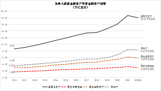 自2010年以来,加拿大家庭金融资产总额从8.62万亿加元增长到18万亿加元,其中寿险和养老金资产从1.65万亿加元增长到2.95万亿加元(见图3)。